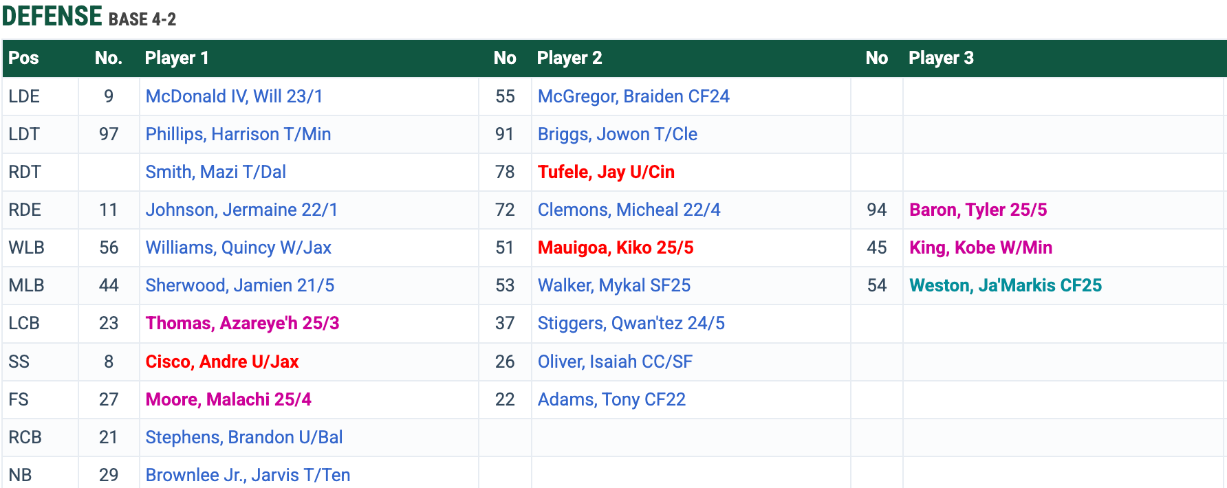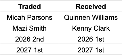 We can cancel out the 2027 firsts (that might be generous, given the trajectory of the Packers and Cowboys, but we’ll stick with it). That leaves Micah Parsons and Mazi Smith for Quinnen Williams and Kenny Clark, with the difference between where the second and first round picks fall. At the moment, that’s a jump from pick 46 to pick 24, roughly the equivalent of a mid-fifth-round pick. It’s impossible to frame that any other way than a loss for the Cowboys.