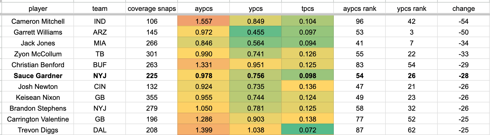 Not getting thrown at is one of the main responsibilities for a cornerback, and Gardner remains one of the best in the league at that. Now, there are the big plays given up this season. Gardner is one of the most impacted players by adjusting yards for touchdowns and interceptions (using the pro-football-reference formula that counts 20 yards for a touchdown and -45 for an interception).