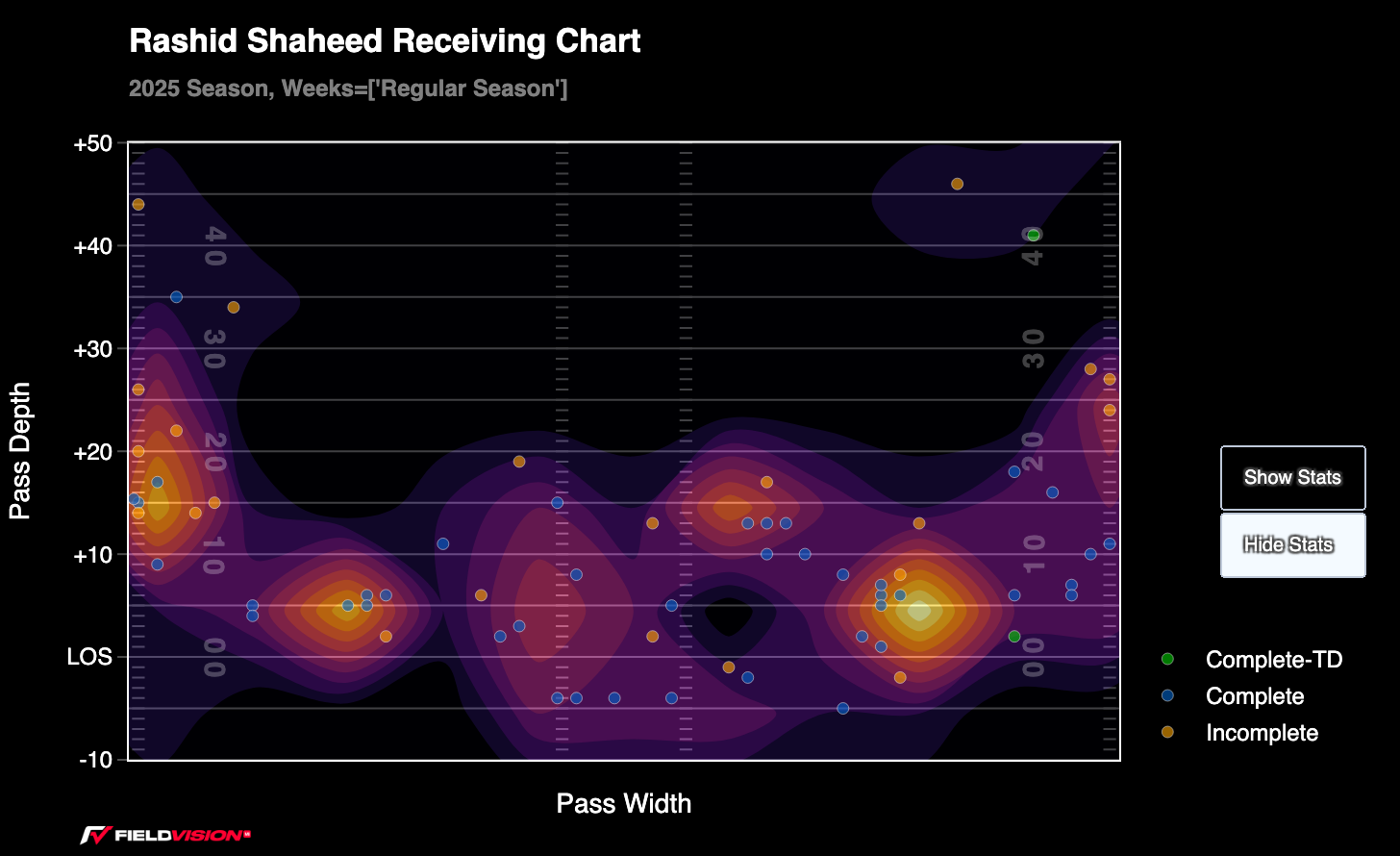 Shaheed now goes to a team that has already been one of the league's best passing units — Seattle is first in passing DVOA through Week 9. Sam Darnold has been one of the league's best deep throwers as he's completed a league-high 61.3% of throws of 20 or more air yards, according to FTN. That might not be a sustainable rate for a full season, but Seattle just added one of the best vertical receivers to line up outside with Jaxon Smith-Njigba. He can win deep (he's only 2-of-11 on deep targets this season, but that has more to do with the quarterback play) and also win over the middle of the field. Per Next Gen Stats, he's caught 12-of-19 intermediate targets this season.