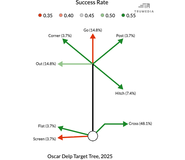 No tight end spent more time lined up inline than Georgia’s Oscar Delp at 81% of his snaps, but he also might be the biggest projection in this class. During the 2025 season, Delp only ran a route on 39.3% of Georgia’s overall dropbacks. He only ran a route on 63.9% of the dropbacks when he was on the field, a rate higher than only Indiana’s Riley Nowakowski’s 56%. Delp didn’t run at the combine, but was reportedly in the 4.4s at the Georgia Pro Day. That athleticism shows when he’s running down the seam, but that wasn’t a big part of his game. It wasn’t as if Delp was some efficiency monster on the routes he did run. He was target on just 14.5% of his routes. Nearly half of his 28 targets in 2025 came on crossing routes, which accounted for a class-high 22.3% of his routes.