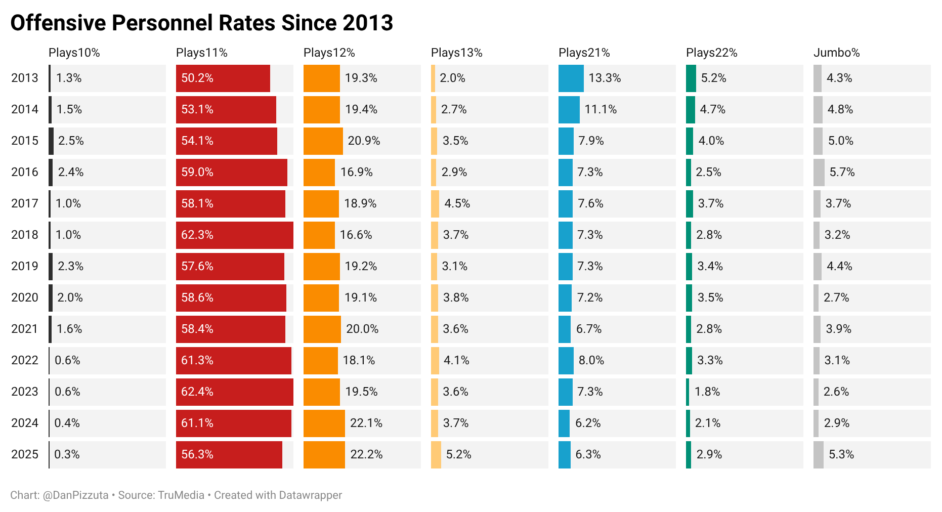 More tight ends are also on the field more often. One of the most covered schematic trends during the 2025 season was about how the Los Angeles Rams leaned into 13 personnel, but deploying more tight ends was a league-wide effort. With NFL offenses wanting to get heavy in an attempt to get bigger bodies on the field against nickel defenses or force defenses into using more linebackers to match the size, offenses leaned more on tight ends — a big difference from when offenses would use a fullback and two-back sets to set the tone, even earlier this decade. While 11 personnel still makes up for more than half of the league’s offensive plays, three-receiver sets had a relatively massive drop from 61.1% in 2024 to 56.3% in 2025, the lowest rate since 2015. Meanwhile, the league had its highest rates of 12 and 13 personnel during the 2025 season.