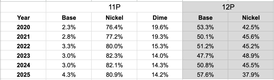It’s not just that offenses are using tight ends differently; defenses have changed their approach to those multiple-tight-end sets. From 2021-2024, defenses matched 12 personnel with four defensive backs on the field around half the time. That jumped all the way up to 57.6% in 2025.