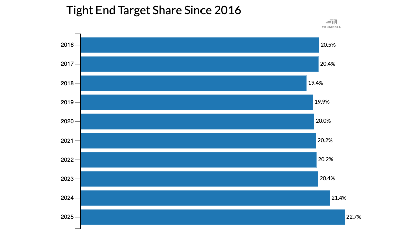 Tight ends have become more important than ever in the modern NFL. Last year, 22.7% of passes league-wide were thrown to tight ends. That’s the highest mark of the past decade.