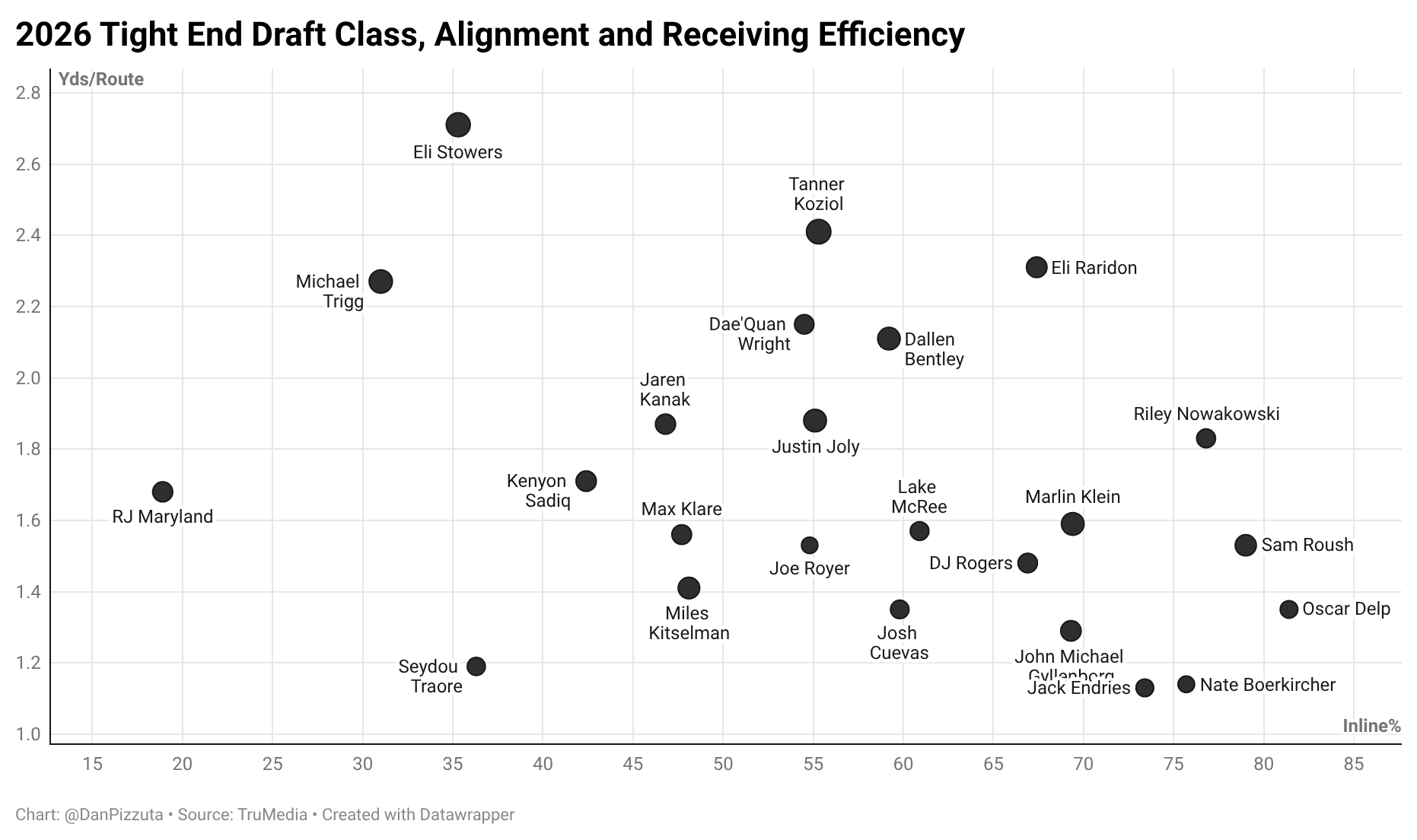 Last year, of the 73 NFL tight ends who ran at least 200 routes, just five played inline on 35% or fewer of their snaps — Dalton Kincaid, Isaiah Likely, Darren Waller, Mark Andrews, and Mike Gesicki. That puts him in a specific bucket of players and even within that, there are layers. Can Stowers be closer to a healthy version of Kincaid, who was inline for 35% of his snaps yet was the top tight end in yards per route run (2.83). Or will he have to be closer to Gesicki at the NFL level, who was inline on just 9.7% of his snaps and was only 41st in yards per route run — both clogging up a spot in the alignment and not being an efficient enough pass catcher to make up for it?