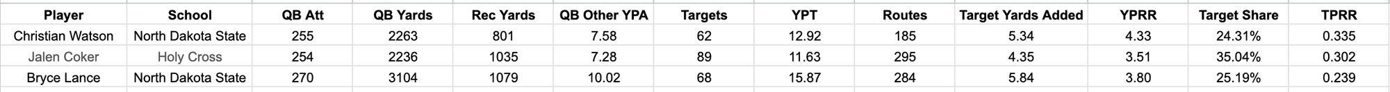 Another way this metric can be helpful is to find value in some of the mid-tier receivers who come out on top. We’ve also had a good recent look at FCS receivers who clearly outperformed their surroundings. Enter Bryce Lance, brother of Trey, from North Dakota State. Lance leads this class in Target Yards Added and has metrics similar to those of other FCS receivers, Christian Watson and Jalen Coker.