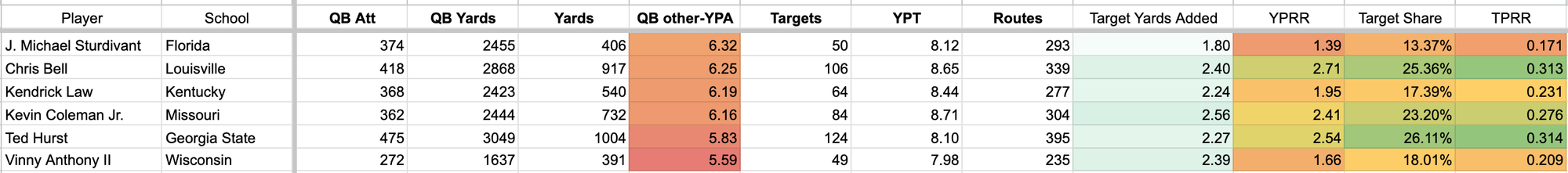 A way to help differentiate those offenses is a metric I’ve called "Target Yards Added." Simply, Target Yards Added takes a wide receiver’s yards per target and subtracts yards per attempt when the quarterback throws to anyone else on offense. That way, we get a bit of a baseline of what the overall production was and what a given receiver adds to it. College offenses are weird and it can be useful to understand that when analyzing receiver prospects. These numbers are all based on the receiver’s final college season.