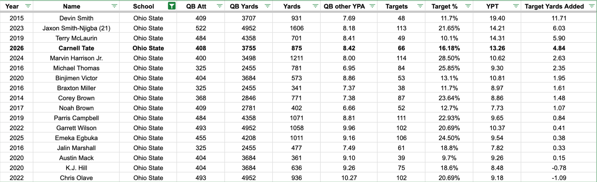 The sweet spot of this analysis is when the receivers who are considered the best prospects in the class also show up as the ones who added the most to their offenses. This is what we have this season with Ohio State’s Carnell Tate. Tate, who came in at 6-foot-2 and 196 pounds in Indianapolis, is widely, though not unanimously, viewed as the top receiver in this class.