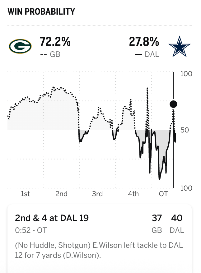 With 1:15 remaining in overtime, the Green Bay Packers had the ball on the Dallas 25-yard line with two timeouts remaining. Down by three after the Cowboys kicked a field goal on the opening overtime possession, the Packers could have won with a touchdown. After a six-yard pass to Romeo Doubs put the ball at the 19, Green Bay had a 72.2% win probability, according to ESPN.