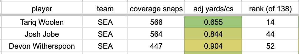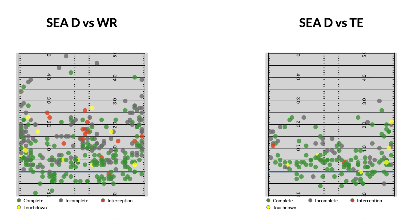 While Seattle’s secondary is filled with monsters, the linebackers can be exposed in coverage, especially when they’re so focused on playing downhill. Ernest Jones is everywhere for this defense, but was 46th in yards allowed per coverage snap among linebackers during the regular season. The short middle of the field is where the Seahawks have had trouble against tight ends and you can see how the sidelines are much better defending against wide receiver targets.