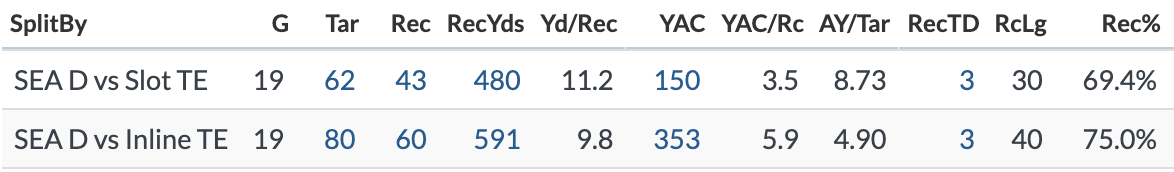 The Seahawks have allowed a higher explosive play rate to tight end targets (17.1%) than to wide receivers (13.1%) and 11.4% of targets to tight ends have gained 20 or more yards. The Seahawks are also worse against tight ends who line up in the slot, which Henry does on about a third of his snaps.