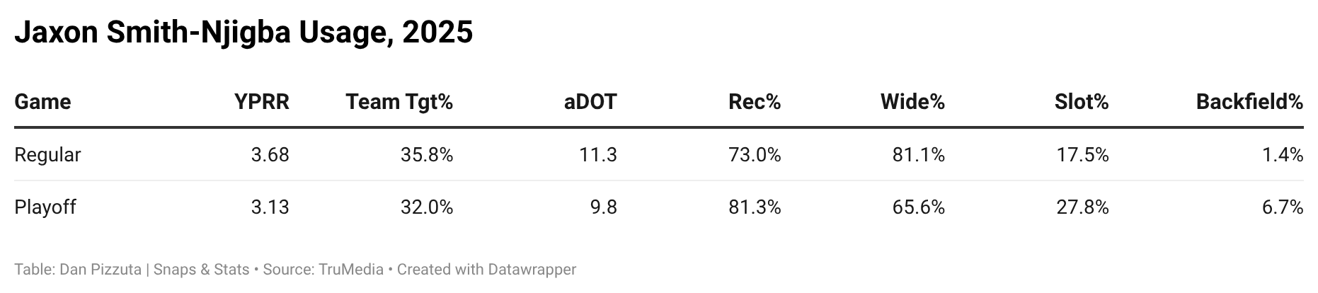 Jaxon Smith-Njigba might be the best offensive player in this game, which includes an MVP runner-up. For the first half of the season, Smith-Njigba was on pace to shatter the single-season receiving record before his raw production slowed with the rest of Seattle’s offense. Still, Smith-Njigba was second among all receivers in yards per route run behind Puka Nacua and led the league in target share at 35.9%. The only player with a higher target share since 2010 is 2012 Brandon Marshall, who had a 40.1% target share in 2012. We’ve never seen a team get to a Super Bowl with such a focus on one receiver in the modern passing-boom era of the NFL.