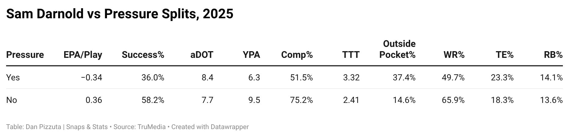 As has been the case throughout his career, Darnold is still one of the most susceptible quarterbacks when pressured. When kept clean, Darnold was ninth among quarterbacks in EPA per play. When pressured, that dropped to 24th. Per FTN, Darnold’s turnover-worthy throw rate jumps from 2.7% when not pressured to 5.7% when pressure arrives. It’s not just that Darnold decides to put the ball into danger; the pressure changes how Darnold processes and where the ball goes. Darnold extends plays outside the pocket more often and his throws targeting wide receivers drop significantly.