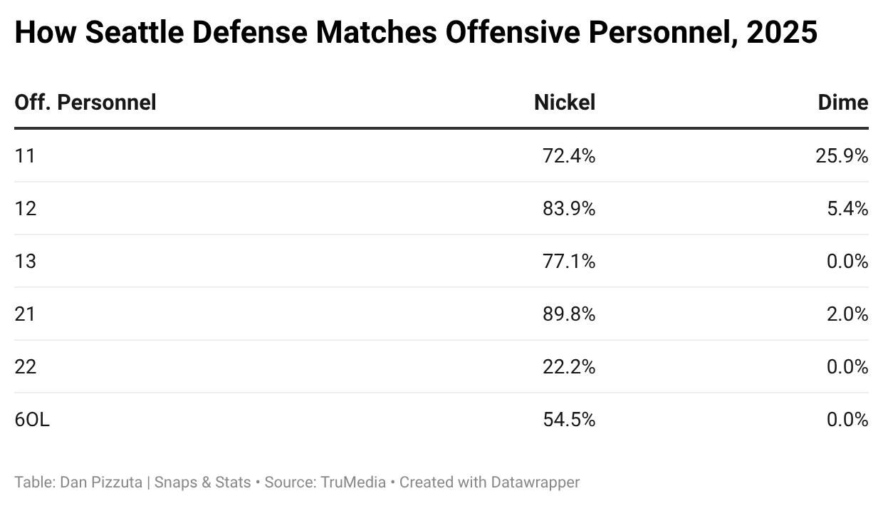 The Seahawks don’t play with four defensive backs on the field — they’ve done so at a league-low rate of 6.7% as the only team below 10% this season. Instead, Seattle plays nickel on 75% of snaps. The key to the Seahawks doing this is rookie Nick Emmanwori, the 6-foot-3, 220-pound safety, who can play all over the field. When Seattle is in nickel, Emmanwori is typically the slot corner. He then plays more of a linebacker role when the Seahawks go into dime.